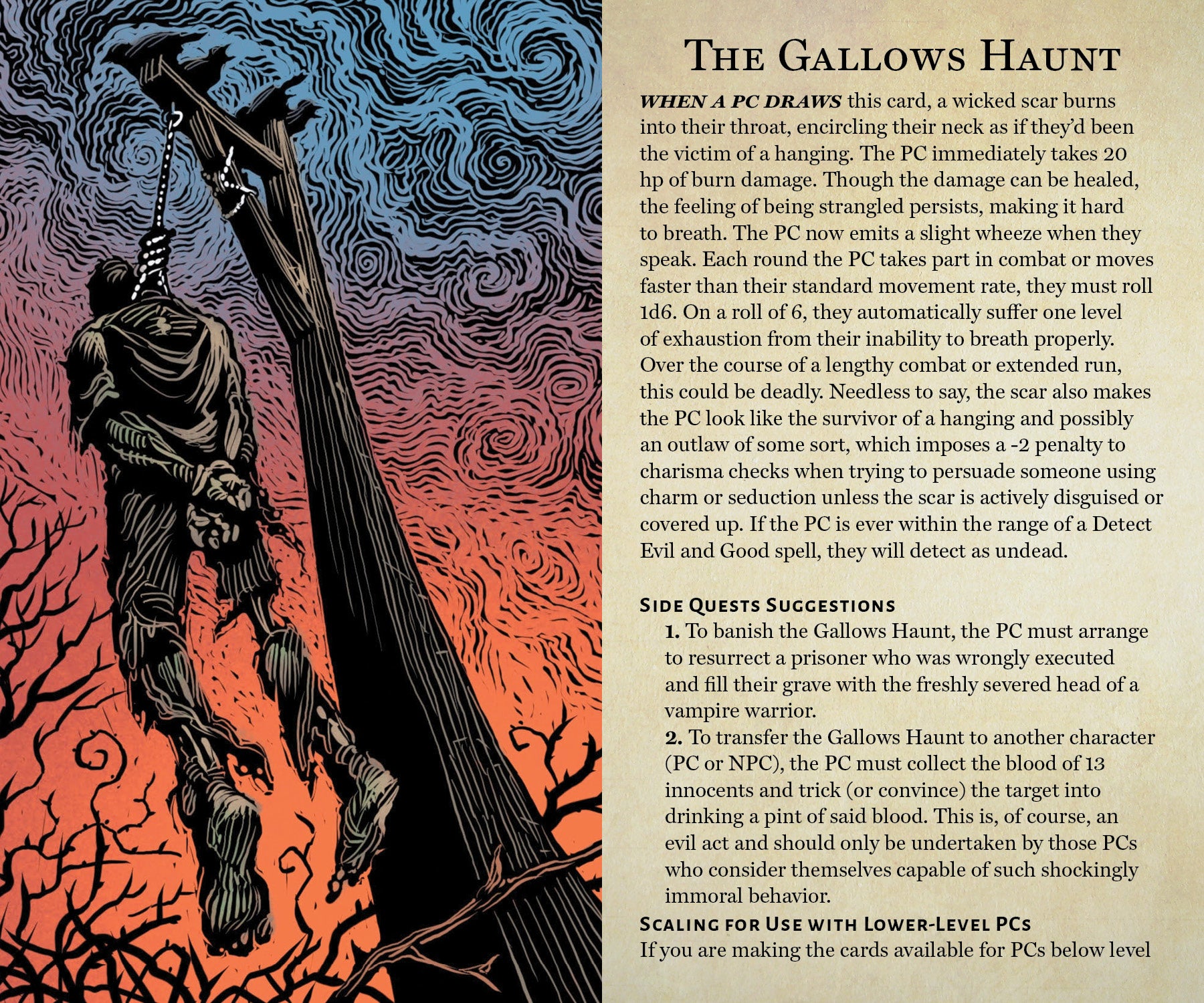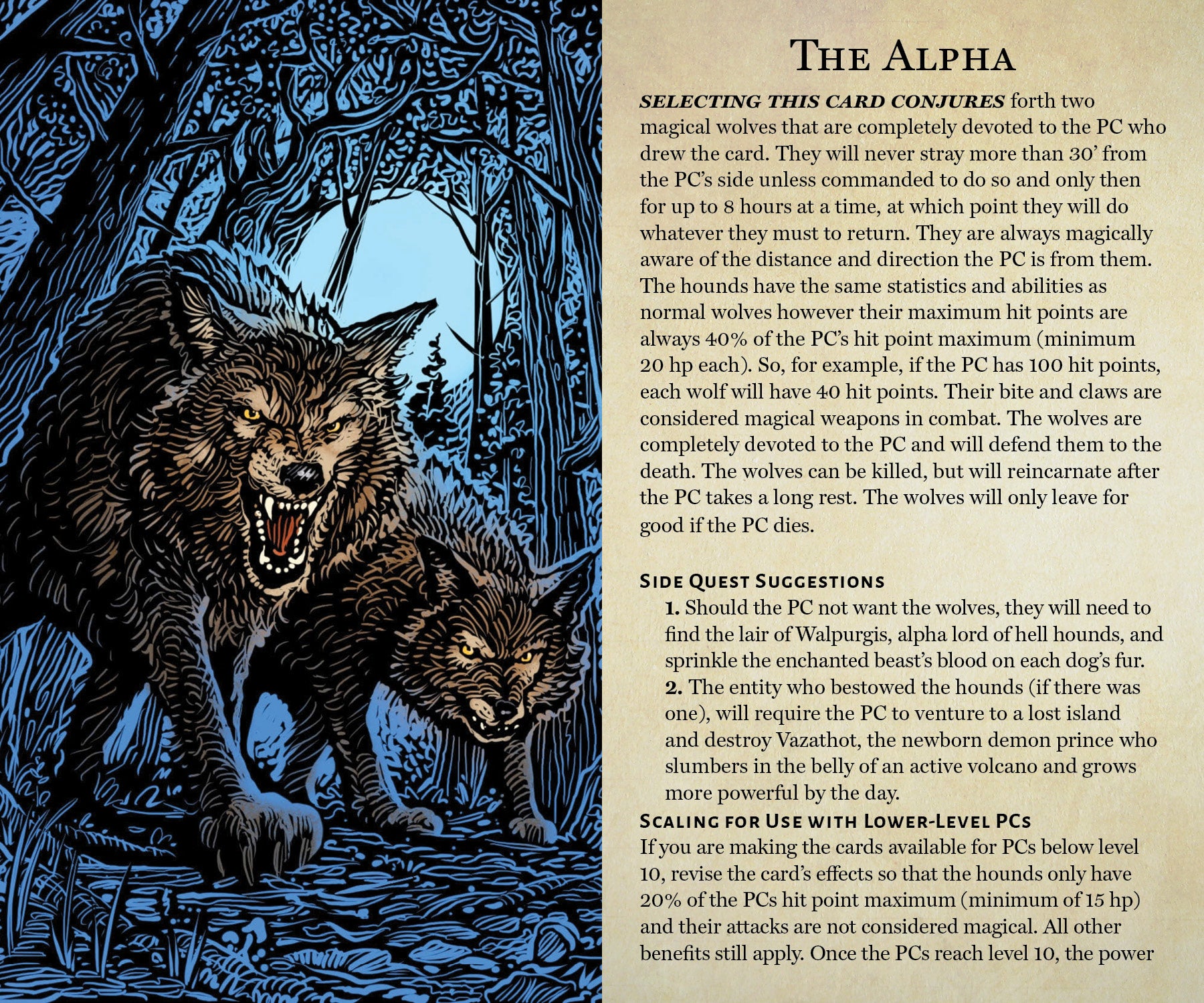 a guidebook containing the mechanical effects of each card, two related quest hooks for each, and tips for scaling them for characters below level 10