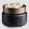 This warmer features a classic bronze dish sitting atop a black base with a bark-like, primitive texture.