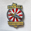 A circular enamel pin with a red and white number wheel and a spinning dagger in the center, reading Roll For Initiative.
