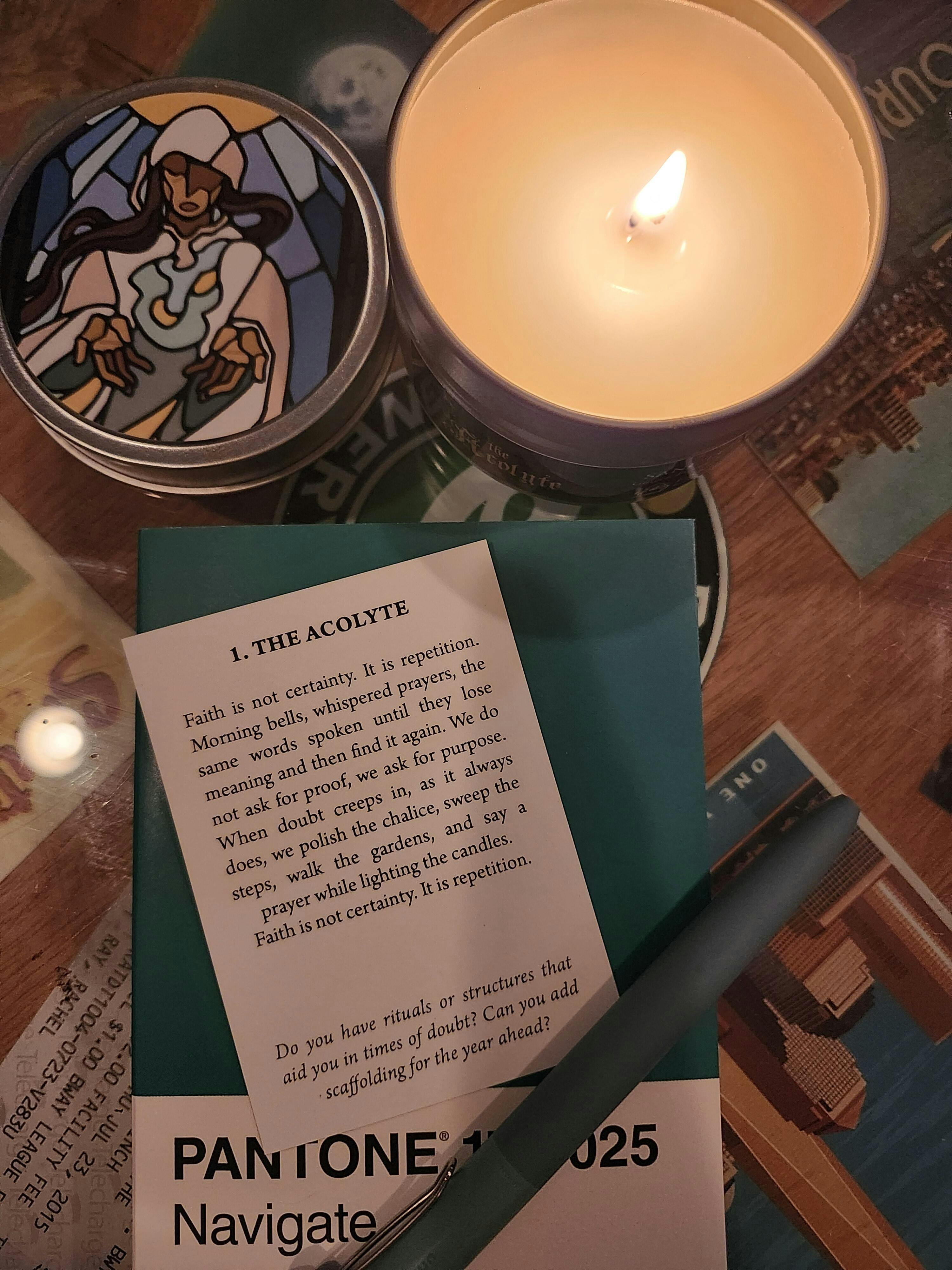 Themed after various archetypes from role-playing games and inspired by the beauty of stained glass cathedral windows, each uniquely illustrated card is paired with a reflection from the perspective of a townsfolk, soldier, or other member of a medieval fantasy village. Pick a new candle each day, read the words, and reflect on the joy, growth, and loss of the past year.