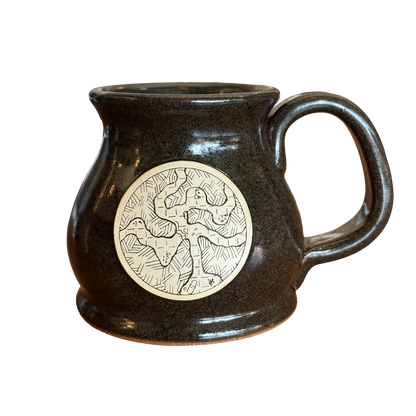 Dungeon delvers assemble! Our cermic potbelly mug is the perfect cozy cup to enjoy a brew during your game! Hand crafted and featuring a whimiscal shape it holds 12 oz. of hot or cold liquid and is perfectly safe for the microwave or dishwasher. On the front it features a hand drawn dungeon map which served as Cantrip's original logo for 4 years!
